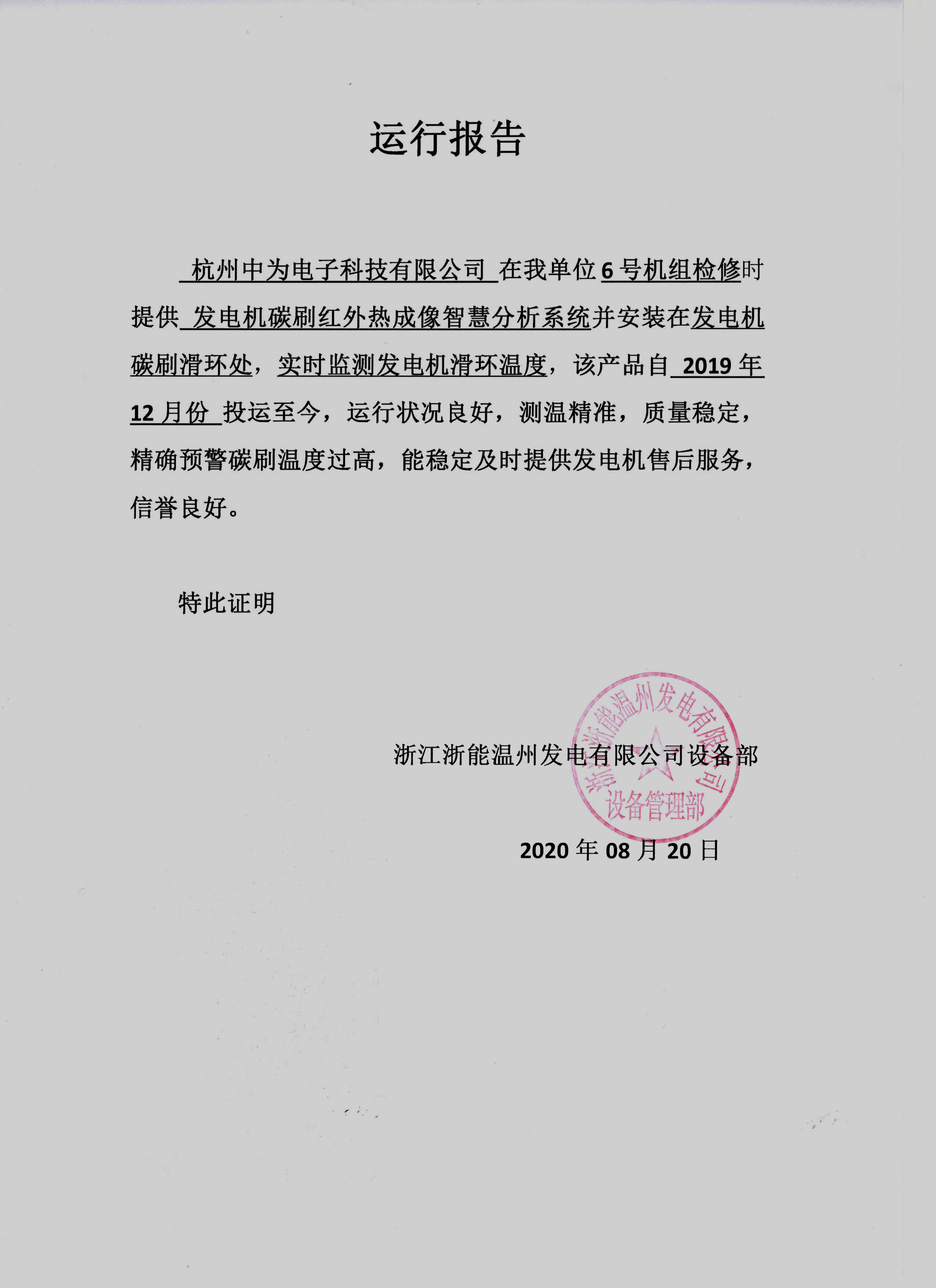 浙江浙能溫州發(fā)電有限公司5、6號(hào)機(jī)組加裝發(fā)電機(jī)碳刷紅外熱成像智慧分析系統(tǒng)