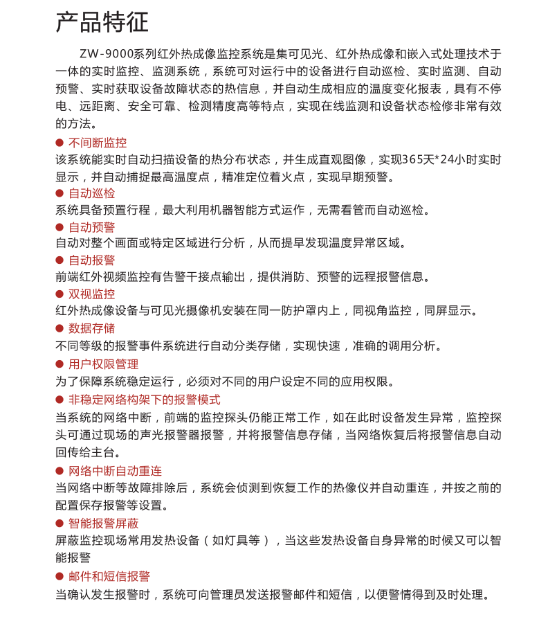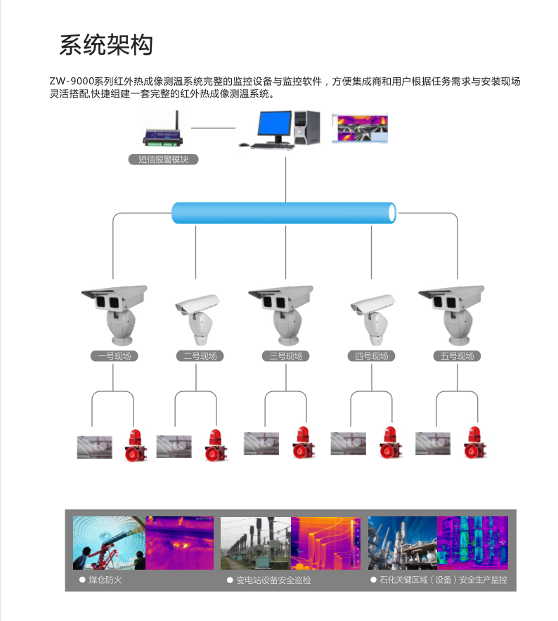 高精度多角度的紅外熱成像畫面判斷碳刷系統(tǒng)的運(yùn)行狀況及周邊風(fēng)溫,并實(shí)現(xiàn)報(bào)警功能;使用超大規(guī)模組網(wǎng)技術(shù),將電廠所有紅外探測(cè)器并網(wǎng)到一個(gè)系統(tǒng)內(nèi);超前預(yù)警,對(duì)可能發(fā)生的故障信息做出超前預(yù)警;前置紅外探測(cè)器能脫離后臺(tái)獨(dú)立工作報(bào)警;內(nèi)置溫度閥值與溫升速率雙重智能報(bào)警分析算法;可預(yù)置工作狀態(tài),生成歷史溫度曲線,將工作狀態(tài)與溫度曲線重疊分析,得到不同工作狀態(tài)下的溫度特性;定時(shí)定點(diǎn)對(duì)設(shè)備的工作狀態(tài)做出診斷,并生成診斷報(bào)告;構(gòu)建數(shù)字化、標(biāo)準(zhǔn)化、智能化的熱成像大數(shù)據(jù)平臺(tái),提供檢測(cè)任務(wù)數(shù)據(jù)統(tǒng)計(jì)、工作報(bào)表展示、數(shù)據(jù)查詢、圖像分析、歷史趨勢(shì)分析等豐富的數(shù)據(jù)管理;熱成像技術(shù)智能化與互聯(lián)網(wǎng)化的深度融合,實(shí)現(xiàn)本地?cái)?shù)據(jù)與云端數(shù)據(jù)的同步與共享,打破空間壁壘,實(shí)現(xiàn)巡檢任務(wù)跨地域管理;預(yù)置工作狀態(tài),生成歷史溫度曲線,將工作狀態(tài)與溫度曲線重疊分析,得到不同工作狀態(tài)下的溫度特性。
