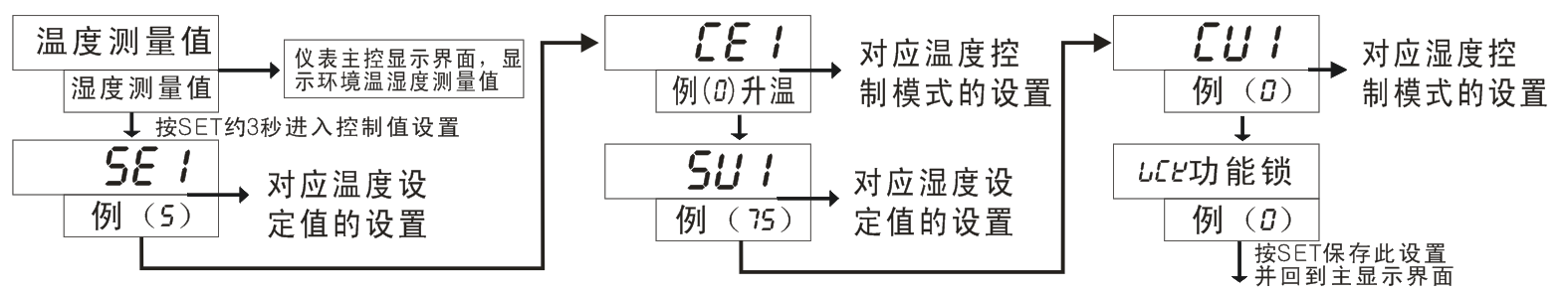 4、濕度控制模式“CU1”:可設(shè)置濕度啟控模式: 目前出廠設(shè)置默認(rèn)為除濕型。(如需加濕型啟控模式為特殊定貨,下單時特別說明)。